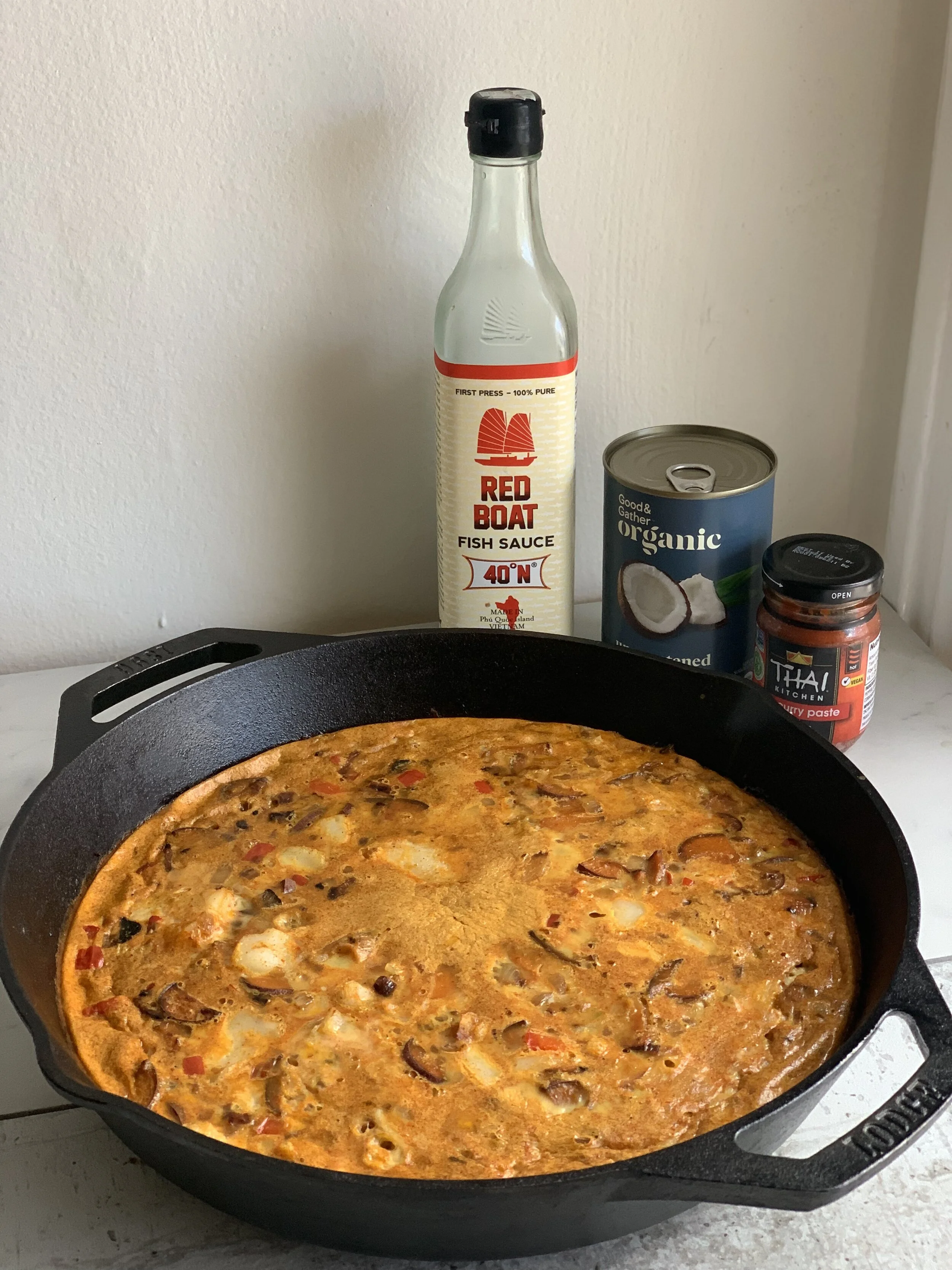 In large mixing bowl, whisk eggs. Add coconut milk, red curry paste, fish sauce, and 1/2 salt, and whisk again, until frothy and blended.